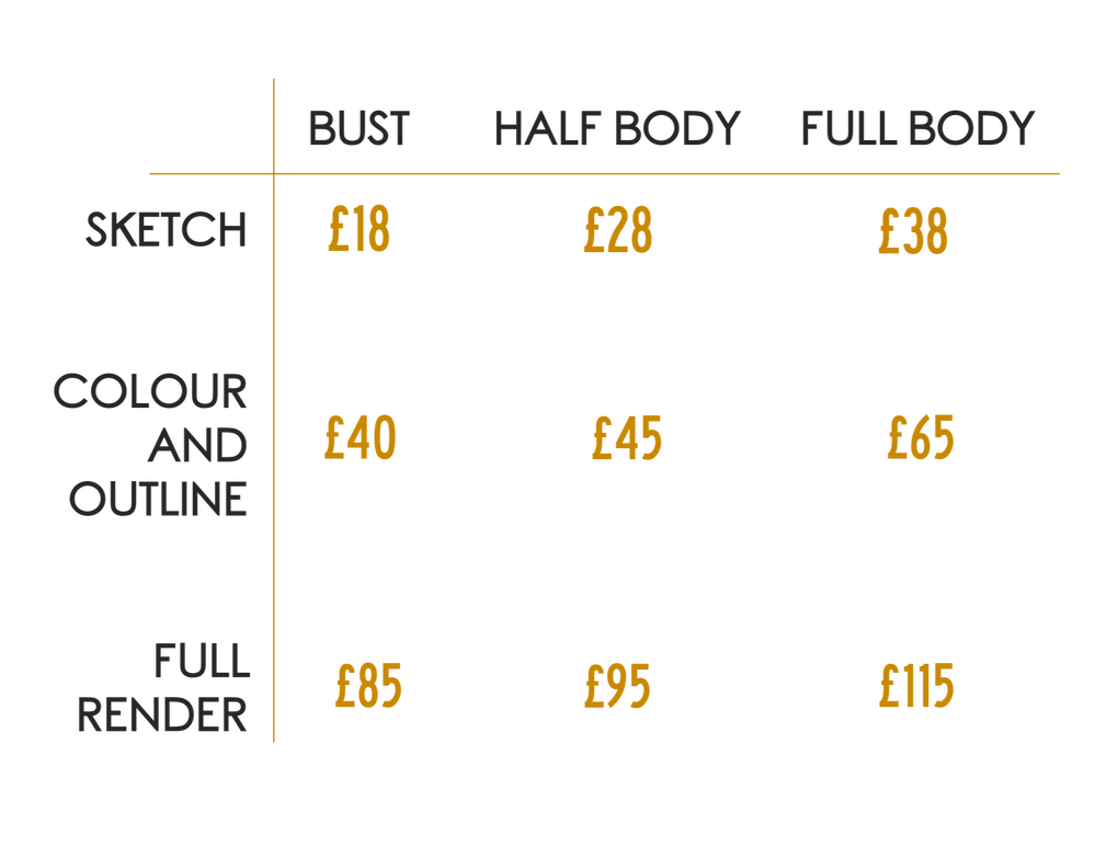 Extra charge for highly detailed backgrounds, elaborate accessories and armor ,tattoos, jewellery and magic effects.Please contact me if you are unsure if this applies to your request.